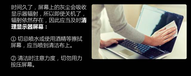 时间久了,屏幕上的灰尘会吸收显示器辐射,所以即使关机了,辐射依然纯在,因此应当及时清理显示器屏幕,要注意一下2点: