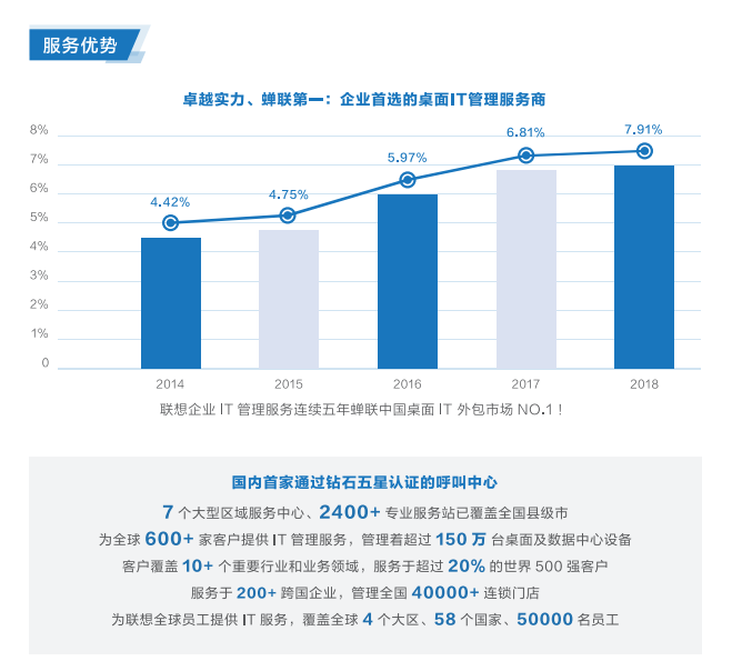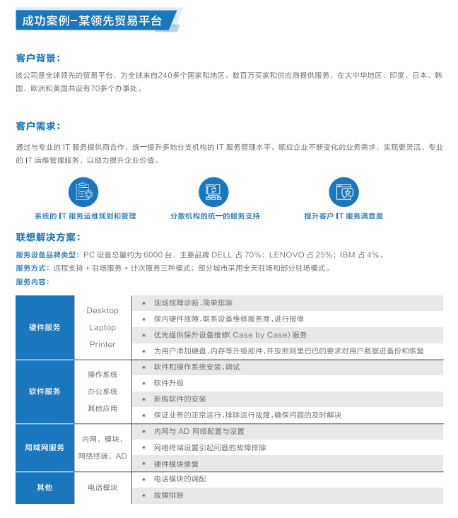 致力于为客户提供包含驻场服务、T外包、咨询服务等在内的全桌面T端运维服务,利用联想全媒体服务台,实现快速响应,旨在让企业T服务更高效,桌面T管理更专业,有效提升智能化时代的企业T管理水平。