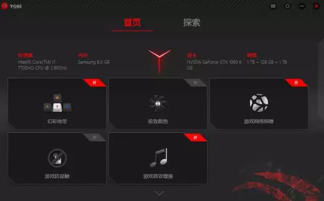 Y720搭载了和Y920/R720一样的“Y空间”软件,可以查看机器配置信息、调节键盘灯效、开启极限散热、游戏网络保障、禁用按键及游戏音效增强功能。说到游戏音效增强功能时,可以接下来介绍一下拯救者Y720的出色的音响系统。