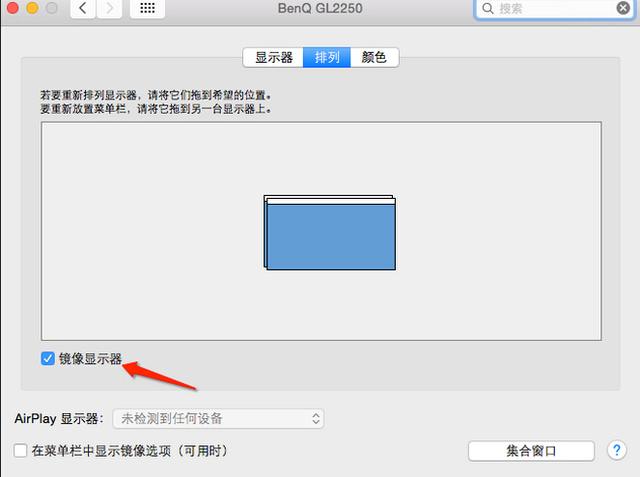 3)、在这个界面点击进入排列选项(需连接好显示器或投影仪才会有这个选项),勾选图中的“镜像显示器”就可以让你Mac和外接显示器的显示内容保持同步了。