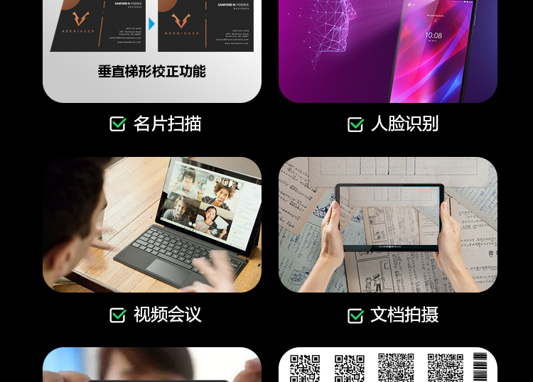 窄边框重工设计,让视野更清晰更自由,10.3英寸100%SRGB全高清画面,1920*1200全高清分辨率,支持4096级压感手写笔,400NITS高亮度;244.8X153.9X8.15MM纤薄机身,460G 超轻设计,全金属外观,铝硅材质面板;前置500万像素,后置800万像素,支持人脸识别,支持梯形校正图片技术,支持扫描身份证/条形码/二维码。