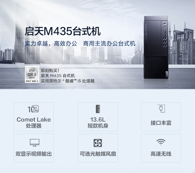 联想启天M435办公电脑采用全新第10代英特尔CPU,拥有强大内芯,突破超凡实力,高达10核/20线程/20MB缓存,高能处理器加身,高效办公不是梦。可选M.2 PCIe NVMe SSD固态硬盘,提供SATA SSD速度2倍的使用体验。充分满足办公、设计、娱乐等多场合需求,让你火力全开。13.6L 短款机箱更稳定,四面钢结构保护坚固耐用。软式脚垫,隔绝机身振动。前置蜂窝状进风孔设计,有效空气流通,促进散热。