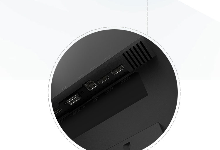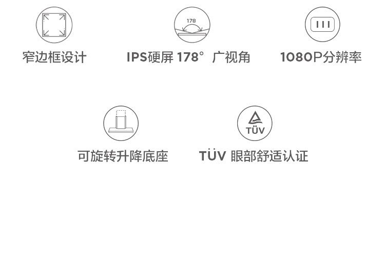 1. 23.8 英寸FHD高清窄边框,轻薄机身$$2. 72%NTSC色域加持,1670万种色彩覆盖,色彩精准还原。$$3. HDMI+DP 多显示接口。以太网接口,供电、音视频、数据传输一线轻松连接,桌面极简。USB 下行接口扩展$$4. 德国莱茵 TUV 眼部舒适度认证,轻松应对长时间办公$$5. 旋转升降全功能底座,兼容支架、壁挂,便捷办公