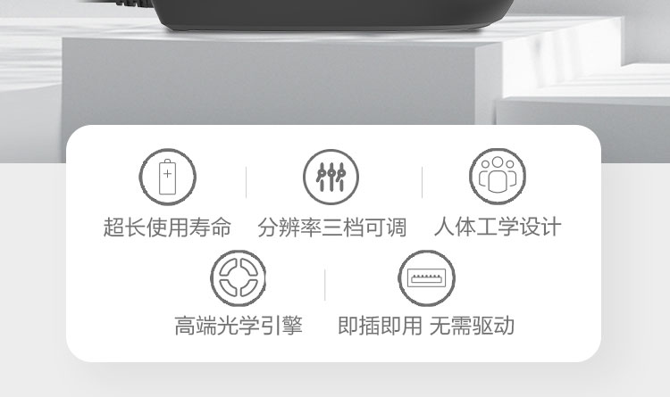 鼠标分辨率三挡可调:800/1200/1600 DPI、适应多种屏幕分辨率、依场景随心调节;125Hz回报率,高速刷新不掉帧,高端光学引擎,定位精准,操作顺畅;左右对称设计、流畅的线条源于对人体工程学的考究,自然握感贴合手型,舒适感大大增加;500万次按键寿命,匠心工艺,可靠办公;无需驱动,方便快捷,线长1.5米,距离从来不是问题。