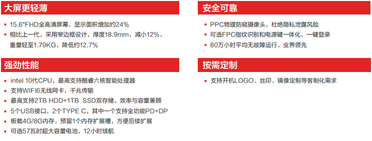 5、80万小时平均无故障运行时间( MTBF ),稳定耐用;PPC物理防窥摄像头,可选FPC指纹识别和电源键一体化设计,一键登录系统,安全可靠。