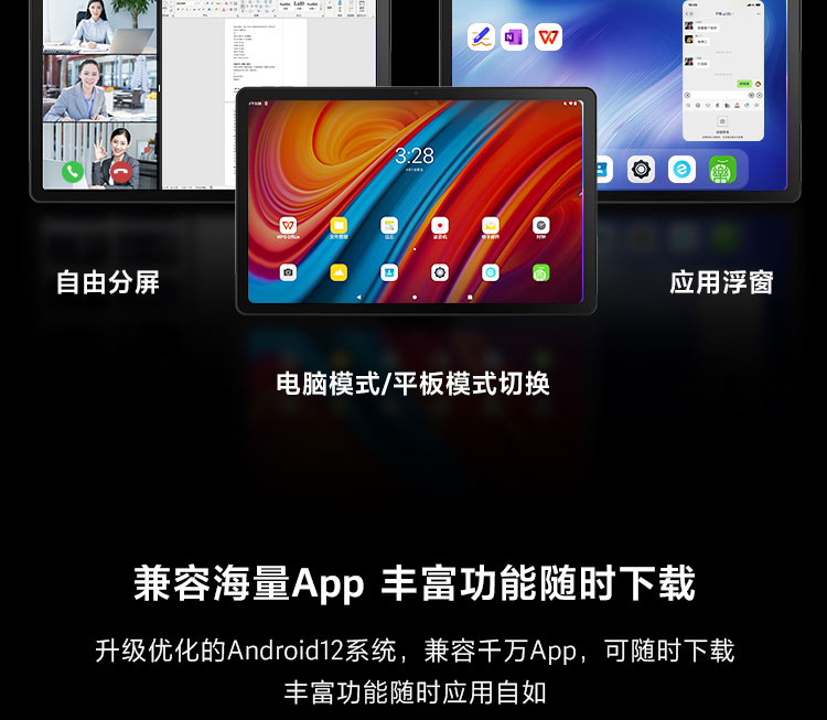1/3构图美学设计,双色拼接,尽显时尚新潮,铝阳极氧化外壳,抗氧化,更耐磨,散热强,四边超窄边框设计,视觉宽度再进一层,超轻薄机身设计,251.2mm*158.8mm*7.45mm;全高清2K LCD全面屏,尽享流畅体验,10.6英寸大画面视角,看更清澈更广阔的世界;搭载MediaTek G80硬核强芯,强劲性能带来出色表现,搭配最高128GB储存配置,疾速加载,拒绝卡顿;搭配前置83°可视广角镜头,精准捕捉面部轮廓并自动对焦,带来更旷阔的应用环境,记录精彩时刻;支持杜比全景声技术(Dolby Atmos