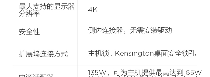 自带电源适配器,可为扩展坞以及插在上面的主机同时供电;带有桌面安全锁孔,可配合Kensington 安全锁,将扩展坞锁在桌面,保护安全;带有主机锁和配套钥匙,可将主机锁在扩展坞上,增强财产安全性;免驱运行。