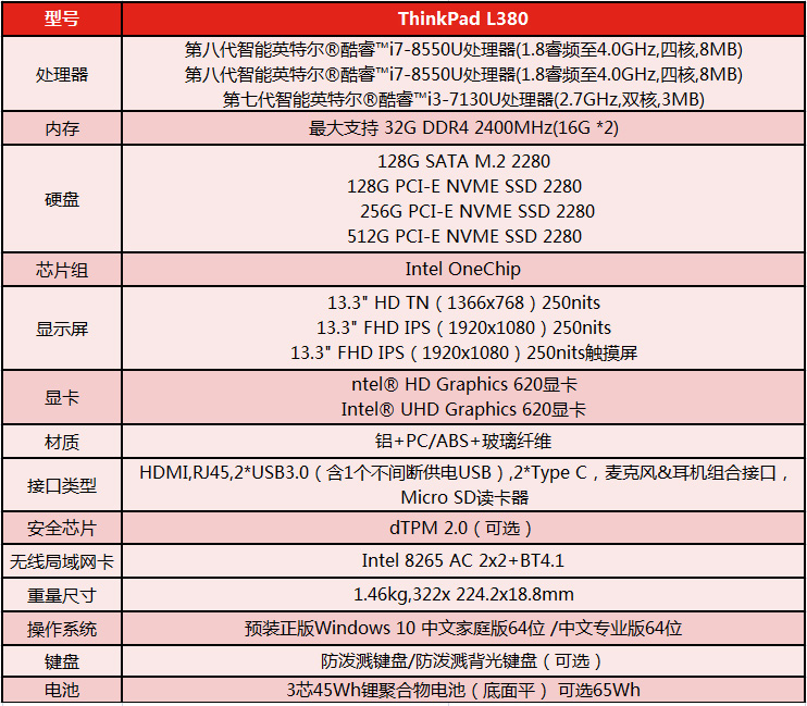 1、ThinkPadL380轻薄商务本内置TPM安全芯片,标配防泼溅键盘,选用鹰翼风扇,更具备180°开合能力,工作更轻松;