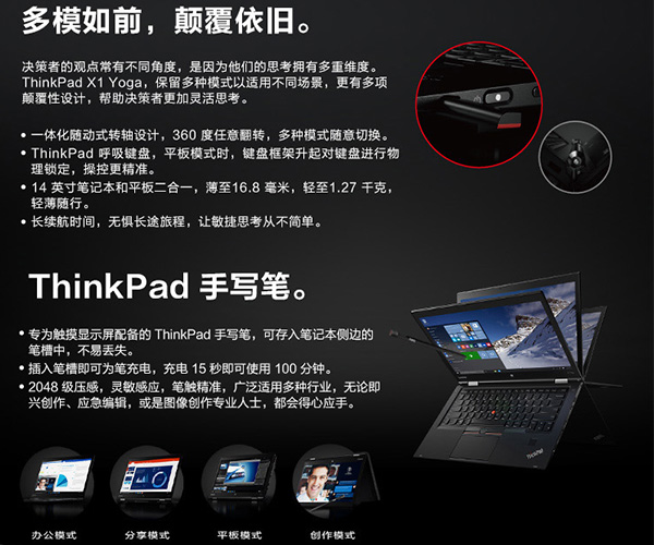在职场中商务办公中,离不开携带方便的笔记本电脑和平板,联想把两大利器很好的合二为一了,在4月份新上市了ThinkPadX1 YOGA超薄本,是一体化360度转轴设计,各种角度任意翻转,多种模式随意切换。不同办公场景下都能应付自如,更有多项创新设计,帮助决策更加灵活思考。联想X1 YOGA创新采用14英寸OLED材质显示屏,它的显示效果非常的清晰、明亮,而且相当轻薄,整体机身只有17毫米,轻质1.3kg,随时可以一只手拿起。它是如此之轻,在你拿起来时肯定感到惊讶。它拥有超赞的屏幕,支持手写触控,2K超高清的分辨率,看起来真的很棒。长时间续航能力,不惧长途或者移动办公,让敏捷思考从不简单。