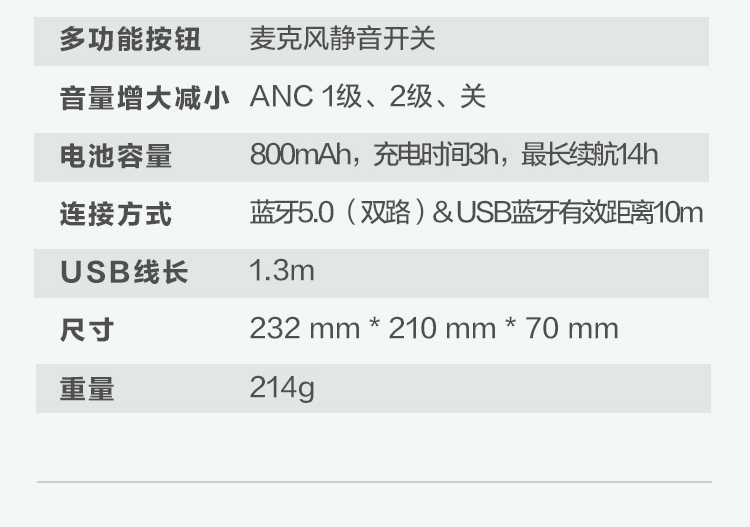 采用ANC主动降噪技术,智能生成环境音的反向镜像,消除噪音声波,营造静谧的聆听效果。麦克风采用ENC环境噪音消除技术,可高效屏蔽恼人的背景噪音,提供最佳的语音通话体验。六个无动臂麦克风,ANC专用4个,ENC专用4个。40mm 钕磁驱动单元,通过专有音质调校,拥有更加细腻真实的表现力、宽广丰富的音域感受。双路蓝牙连接,可以同时连接到电脑和手机,快速接入音频交流。蓝牙5.0技术链接稳定,10米范围不断连,沟通更自如。